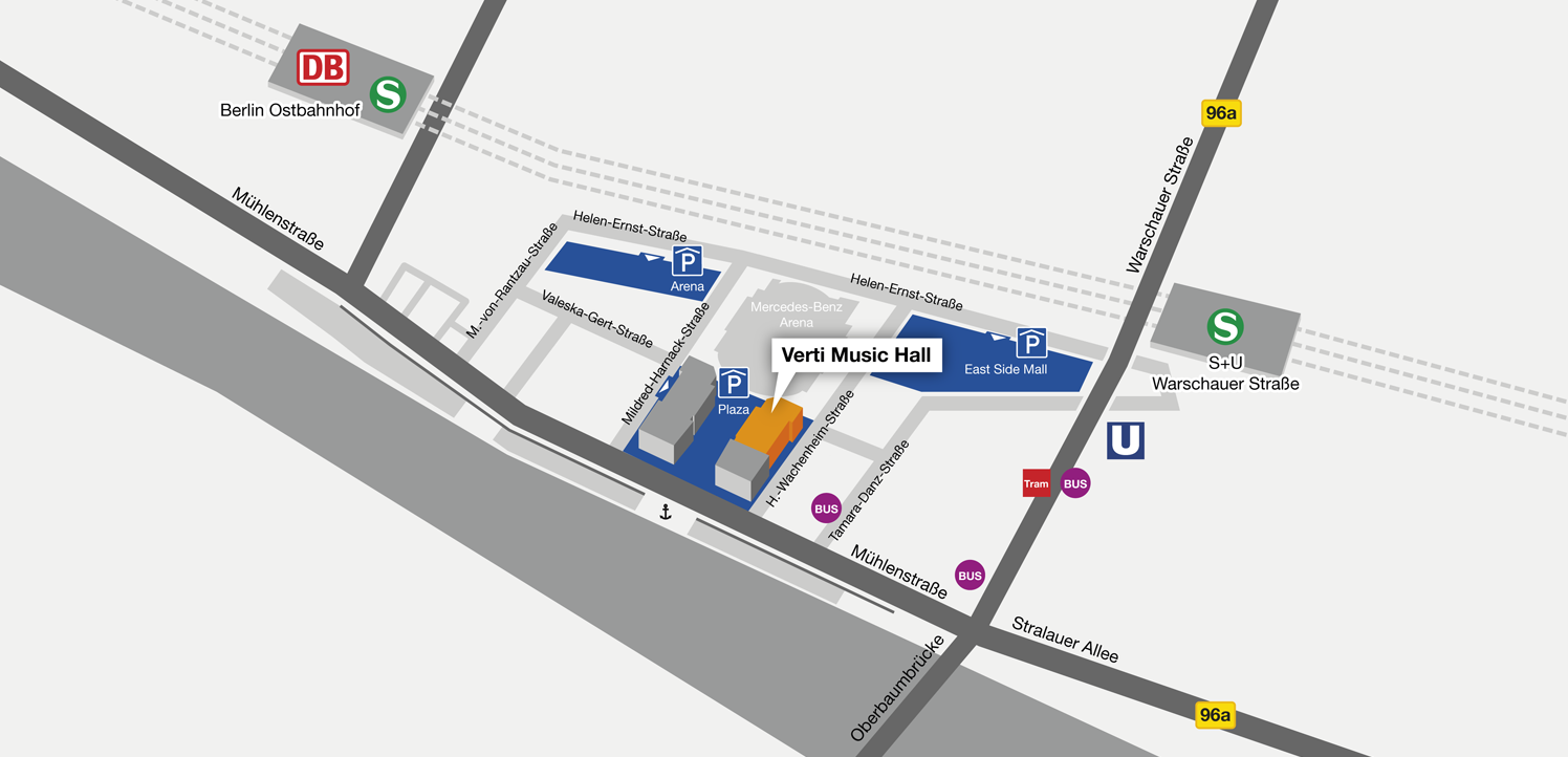 Folgen Sie innerstädtisch am besten der Beschilderung nach Friedrichshain und zum Mercedes Platz. Für Navigationsgeräte nutzen Sie bitte folgende Adresse: